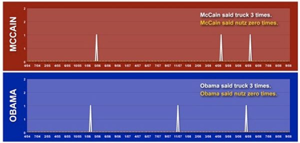 We have seen this service before, this thingy that counts how many times a person said this word or that word, and it is interesting how John McCain says "love" more than Barack Obama, and Obama says "war" more than McCain. But the real story, as tipster Whitney notes, is that neither of them have ever let the words "truck nutz" escape their lips. They are running for president ofAmerica,you know! [ Speech Wars ]