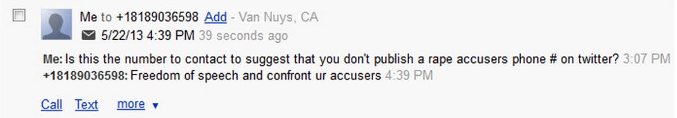 "Is this the number to contact to suggest that you don't publish a rape accusers phone # on twitter?" our anonymous text person sent yesterday.