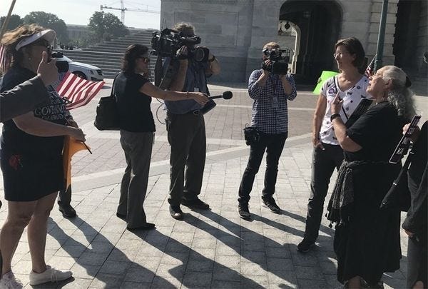 Still, what they lacked in numbers, they certainly also lacked in originality! As senators arrived, the stalwart six shouted "We want Kavanaugh!" Then, when Jeff Flake arrived, they shouted "Flake the Snake!" which is clever, because it rhymes. They could have just gone for "Jeff Flake is a Flake, " but they went the extra mile.
