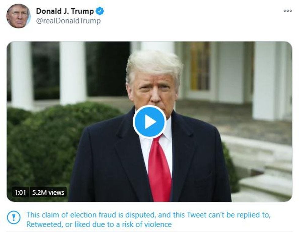 So what does this Mean For America? As it happened, Donald Trump took to Twitter with a little message for his supporters, telling them that they have every reason to be angry because his landslide election win was stolen from them, but could they please go home now? He loves them all very much, and he thinks they're very special, so stand down and stand by, we guess. Twitter was quick to take some very unprecedented action, with this incredible warning: "This claim of election fraud is disputed, and this Tweet can't be replied to, Retweeted, or liked due to a risk of violence."