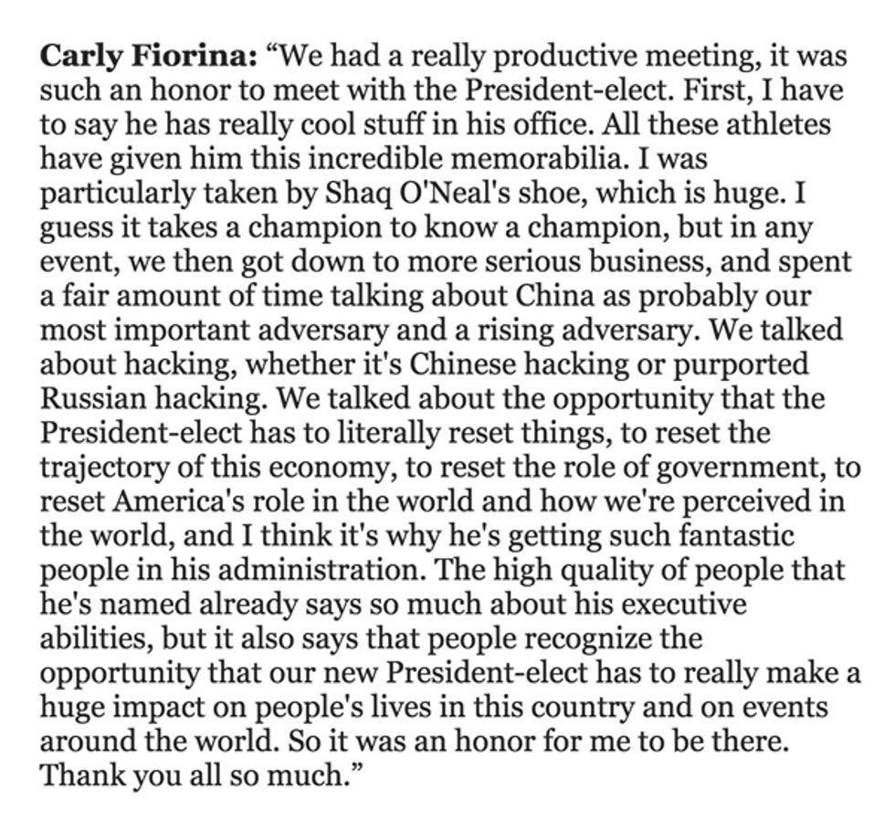 Donald Trump, in what appears to be an effort to fill his administration with as many former Republican primary opponents as possible who aren't Jeb Bush, Ted Cruz, Marco Rubio, or that pathetic guy from New Jersey who tried to suck up to him the hardest, is reportedly considering former Hewlett-Packard CEO Carly Fiorina for the job of Director of National Intelligence. Fiorina met with Trump today at Trump Tower, and had the nicest things to say about him, not to mention the impressive tchotchkes in his office!