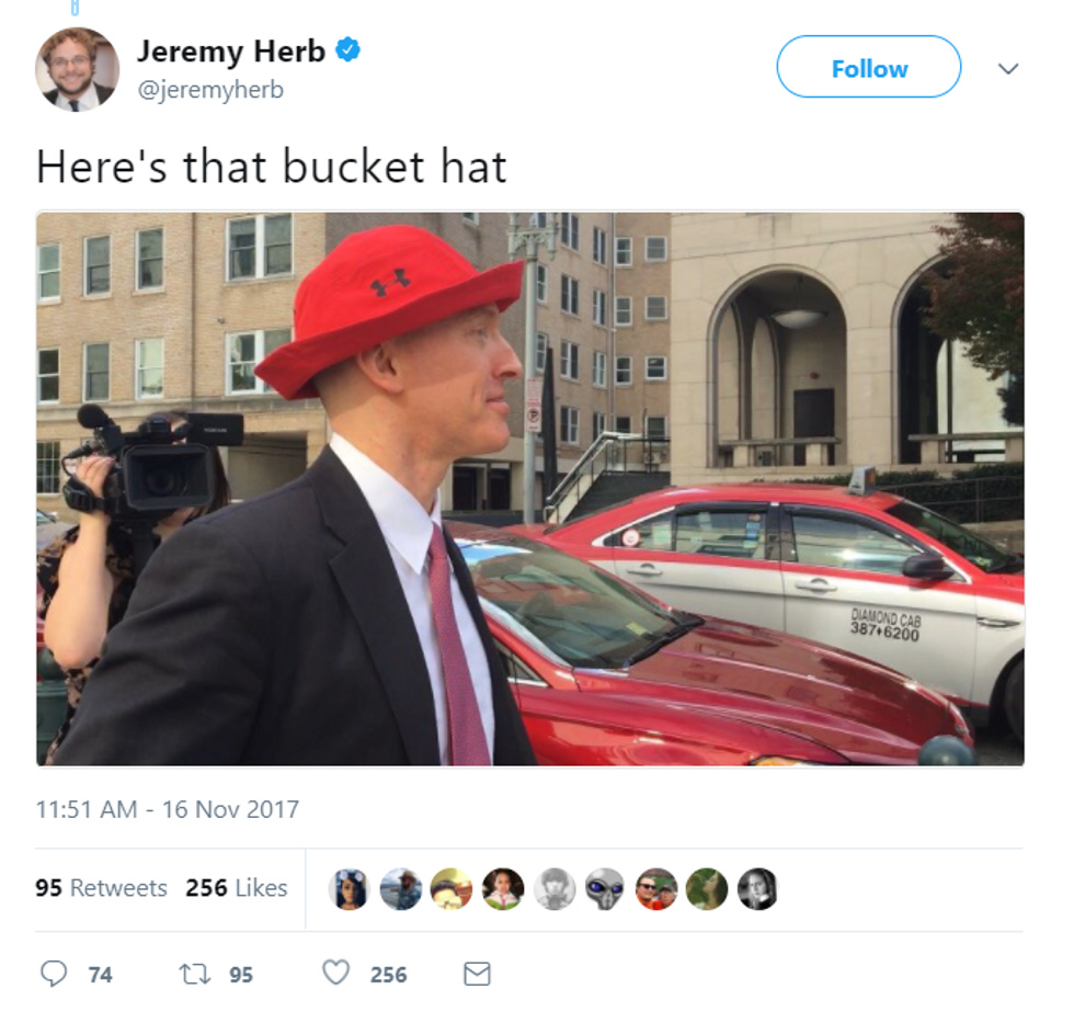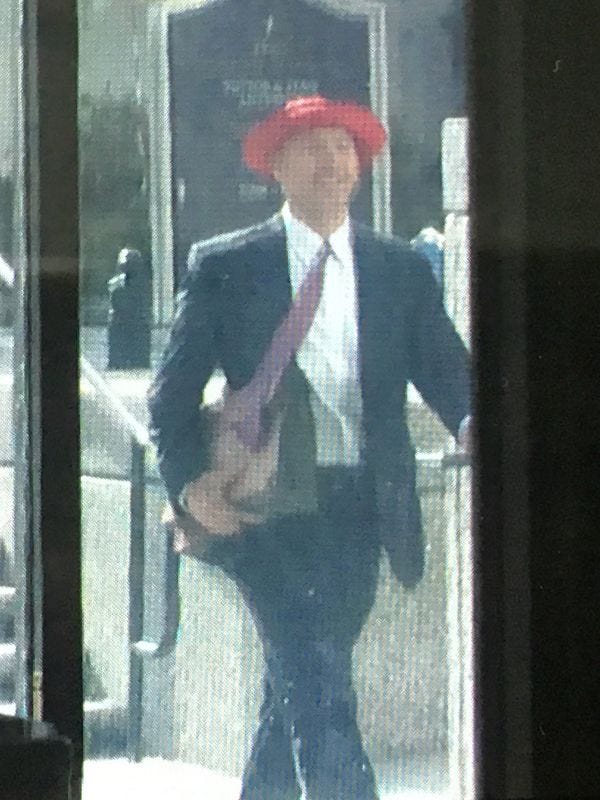 What in hell is that hat? Who wears that hat in public? Is it like a MAGA hat for particularly dapper dandies? Where did he get it? Etsy? Big Lots? Did he spend a long time deciding whether or not to wear it this morning? Does he have that hat in multiple colors?