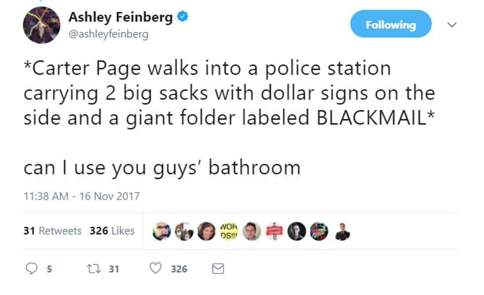 Was there an 1980s movie soundtrack playing as he flitted through the halls of Congress to deliver unto the Senate Intel Committee a bunch of documents that prove once and for all that he's the dumbest fucking Russian spy who ever lived? Or is this a scene from the Broadway production of Thoroughly Modern Millie ? Was Page preceded into the building by a troupe of jolly man dancers singing about how Carter has hit the big time now?