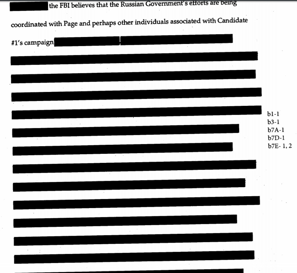 Look at ALL THAT BLACK REDACTED TEXT. "The FBI believes that the Russian Government's efforts are being coordinated with Page and perhaps other individuals associated wtih Candidate #1's campaign [REDACTED TO INFINITY AND BEYOND!]" That, dears, is evidence . It looks like they have a lot of evidence that Carter Page, a buffoon, an idiot, and also a known Russian intelligence asset, may just be more important to this conspiracy than we ever thought. Whoa if true, right?
