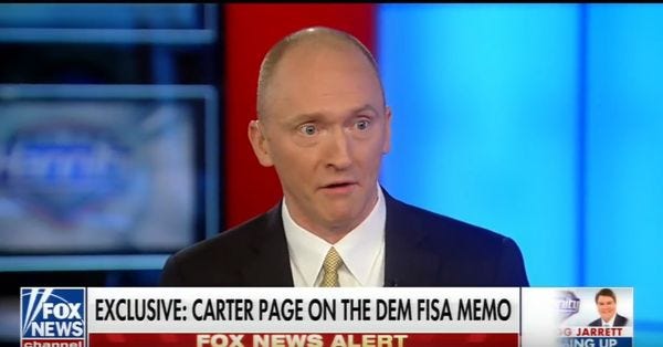 Good night and good luck, Carter Page. If Mr. Mueller comes a-knockin', um ... well, you're fucked. Have fun going on Fox News until then, though!