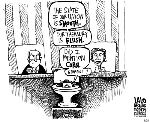 Political cartoons: Blunt, angry, profane. This one, with Bush being flushed down the toilet during his State of the Union address, is pretty typical: blunt but effective for the most part, but then adding a corn-poop joke that somehow goes just over the line.