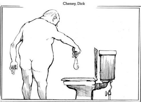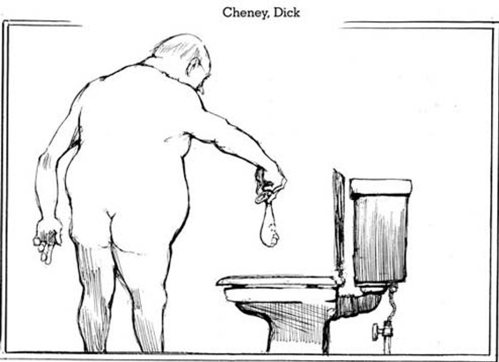 Oh yeah, and this! We can't confirm that this political cartoon was actually drawn for Wonkette, but it was emailed to us without much by way of explanation by nationally syndicated cartoonist Jeff Danziger, and doesn't appear to have been published anywhere else. But what sort of explanation could this require? It's a cartoon about naked Dick Cheney flushing a semen-filled condom with George Bush's face on it down the toilet, and it should probably replace the long-outdated American flag.