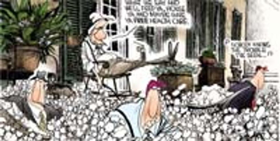 Anyway, you know what else they had back in the day that we're going to revive, nostalgically? Slavery! Real, actual, slavery! Only for white people, apparently. Though we will be forced to wear comical Aunt Jemima-style head kerchiefs! We crackers will be out there just pickin' cotton for Ol' Massa Congress -- though as you can see, that cotton is just growing all over Congress's lawn, right up to his porch! Heck, somebody's gotta pick it, so why not enslave us to do the job free Americans won't do? But don't worry, we'll all get free food and health care, just like they did back in slave times, if by "food" we mean "low-nutrition gruel and scraps" and "health care" we mean "cruel and arbitrary beatings."