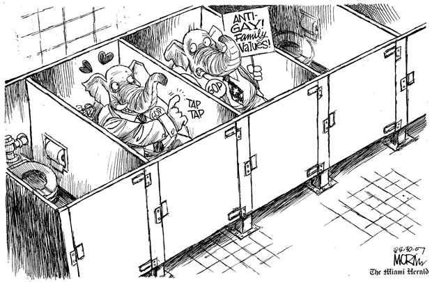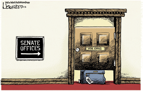 Your Comics Curmudgeon has taken a keen interest in this scandal. It's not because I like to cruise for gay sex in public restrooms ('cause Idon't,OK?), but because I'm going to be flying commercially over the next few days. And if it isn't bad enough that I have to worry about the terrorism and the crying babies and the power-mad TSA agents and the blood clots in my legs, now I also have to worry that, just because I have a wide stance and God forbid might need to pick something up off the floor, I might give some cruiser the wrong idea (and I'm not as tough as Tucker Carlson ) or, worse, give some pretty-boy undercover cop the wrong idea . Modern life -- it's so complicated!