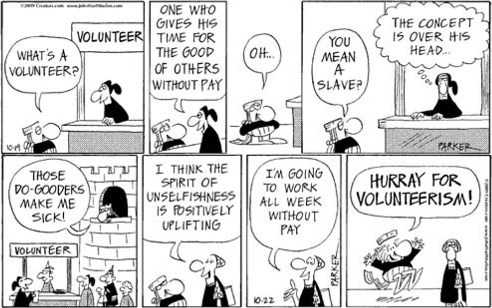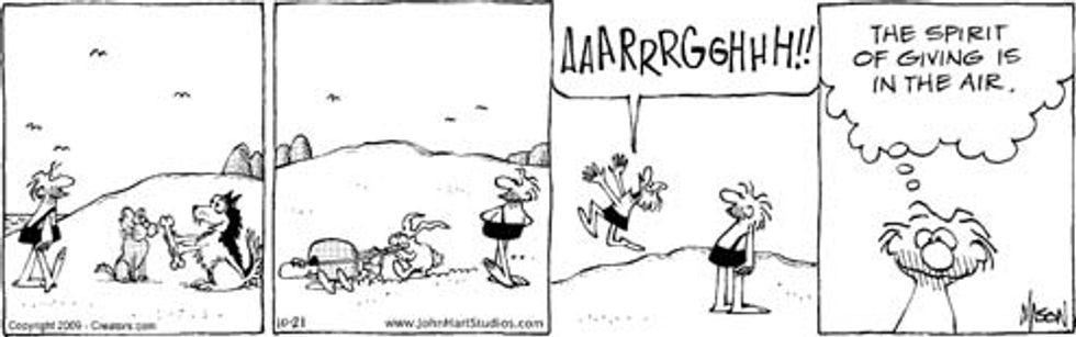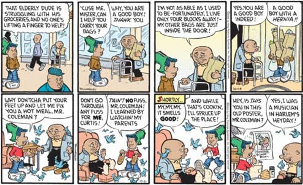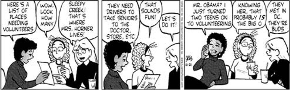 Hello, readers, and welcome to a very special Carton Violence, in which we will turn our eyes away from the foul nightmare that is the editorial pages, and to the innocent, carefree comics pages, which are probably in the back of the section with the TV listings in your local paper! (Ha ha, just kidding, I realize none of you actually read the "paper".) Do you know that this Saturday is National Make A Difference Day, when you're supposed to, like, volunteer or something? Of course you don't, and here's why: because the White House apparently decided that the best way to publicize this to the masses was to encourage the writers ofnewspaper comic stripsto plant pro-volunteering propaganda in their word-and-picture boxes. Do they think that it's 1955? Isn't this the same group of people who won a presidential election entirely by using Twitter? Anyway, the results, as you'll see after the jump, are mostly laughable and terrible, when they aren't actively offensive.