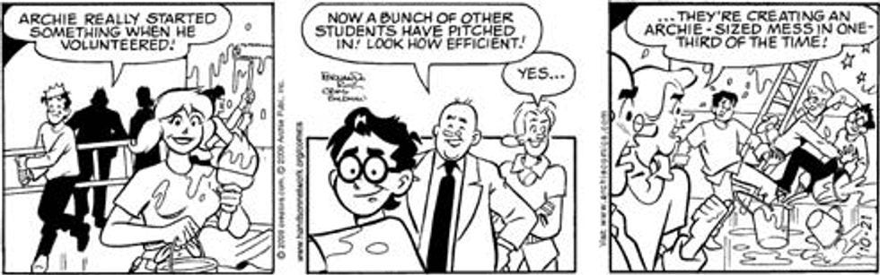Is there anything that can save the world from Obama's terrible army of volunteer sex slaves? There is, in fact, one last hope, and that is America's spectacular incompetence, as demonstrated by the lovable Archie gang! Seriously, Americans can't even to do something like cleaning and painting a school cafeteria -- which many foreigners find so easy that they'll do it for less than minimum wage, even while risking arrest -- without completely fucking it up. So how do we expect volunteers to do any of the things that Obama demands of them -- ending homelessness, cleaning up trash, convincing old people to commit suicide so their desiccated remains can be processed into a concentrated high-protein foodstuff -- if they're just going to make a terrible botch job of it?