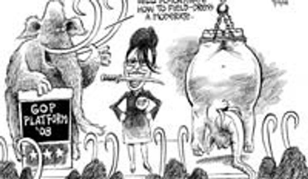 When Hillary dropped out of the race a few months ago, many male cartoonists were bereft. Not because they supported her health care policies, you understand, or because they hated and feared hope and change. No, they're just desperately lonely, and drawing the curves of an ample bosom or shapely behind is as close as they'll come to a woman's touch. So when John McCain personally flew to the Ice Planet Hoth to rescue Sarah Palin from her igloo and make her his running mate, the ink-stained classes were all very excited! This week, we bring you the Story of Sarah: In Cartoon Form.