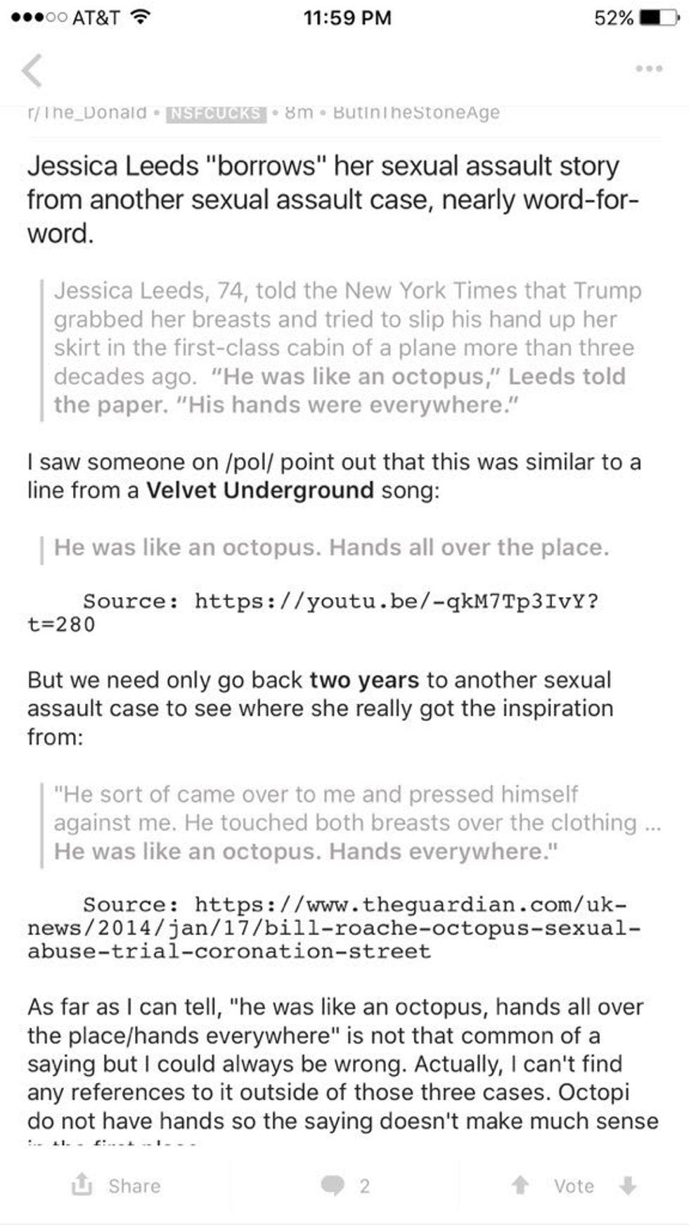 Guys, it looks like we're all going to just concede defeat, cancel the election, and swear in Donald Trump right away. Jim Hoft, the Stupidest Man on the Internet, has conclusively debunked the claims that Donald Trump ever groped anyone, using SCIENCE. Or ROCK MUSIC, which is practically the same thing. You see, one of the women accusing Trump, Jessica Leeds, described Trump's alleged groping on an airliner using language that was nothing more than a line from a Velvet Underground song, thus proving the whole event never happened. Truly, it is investigative work like this that has won Mr. Hoft the reputation he so richly deserves.