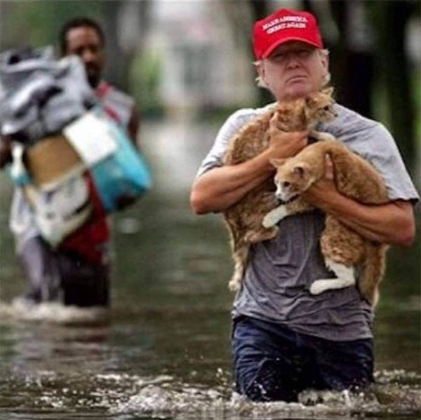 The above photo, which has been going around the interwebs with the claim that Donald Trump helped rescue kittycats from flooding in Houston, is Photoshopped. Not only did Snopes.com locate the original photo, taken during Iowa flooding in 2008, but anyone with a lick of sense knows Donald Trump was baffled by the task of putting relief supplies in a pick-em-up truck, and would certainly never get his pants damp to help another living being unless perhaps there were a hell of a lot of money in it.