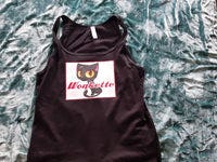 Men’s and women’s black or white tees, and women’s black or white tanks, all with the ADERBS Wonkette kitten (no whip).