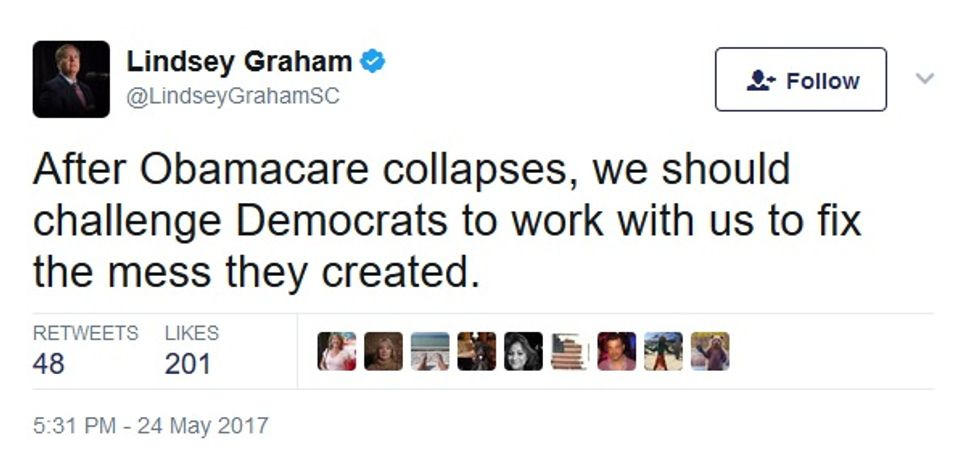Not that the ACA is actually collapsing; apparently Graham is happy to go along with Donald Trump's plan to stab it to death by not actually funding it. That'll teach Democrats to pass a law Republicans don't want to follow. Hooray for "moderation."