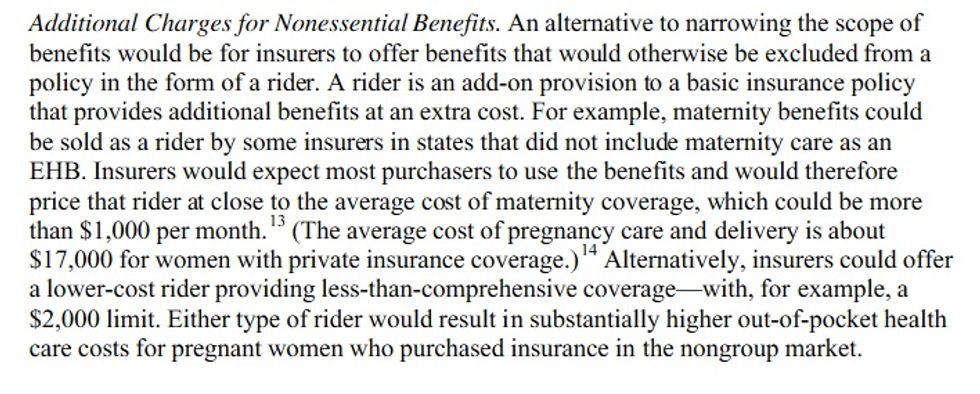 The real fun would come in the red states that opt out of essential health benefits mandates and protections for preexisting conditions. While the preexisting condition protections would remain in place for those with insurance already, anyone who goes two months without coverage would get slammed. With the elimination of mandatory benefits, coverage for non-mandated services would have to be purchased with a separate rider, and that would be especially expensive for people who want the option of using their uterus, which would no longer be covered because so many wingnuts bitched about men having to pay for mammograms and other ladystuff: