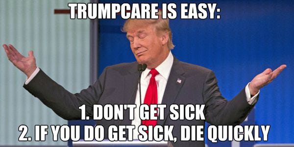 The Congressional Budget Office finally came out with its scoring of TrumpCare 2.O: The Wreckening, and determined that it will leave almost as many Americans without health insurance as the first version did (23 million by 2026 vs. 24 million under TrumpCare 1). And it gets worse: In states that opt out of requiring essential health benefits and protections for patients with preexisting conditions (in which Scott Walker, for one, has already expressed beady-eyed interest ), premiums for many people would go up by tens of thousands of dollars a year, pricing many out of insurance altogether. It's a shit pizza of a healthcare bill, and millions of Americans won't even be able to afford a slice.