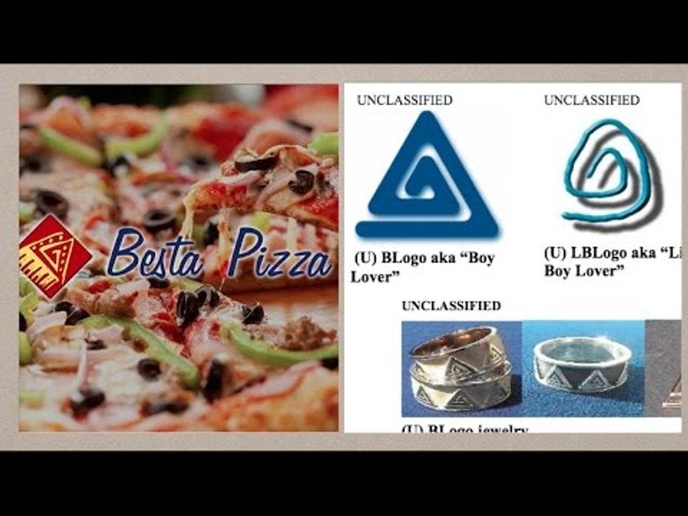 One of the greatest hallmarks of YouTube Conspiracy Videos is the obsession with secret symbols being placed everywhere that supposedly mean things. Usually, a triangle anywhere denotes some kind of allegiance to the Illuminati, but I guess in this case it is pedophilia? I wonder if they think there's someone whose job that is, to put secret symbols into music videos and pizza logos? Like, some guy from the Illuminati or the Pizzagate commission comes by and is like "Hey, you think we could get some more symbols up in here so that weirdos on the internet can point at them and go 'Conspiracy!'?" I honestly kind of hope so.