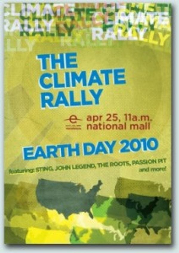 Sunday, April 25: A huge climate rally is taking place on the National Mall on Sunday, where celebrities including Sting, James Cameron, The Roots and Passion Pit will tell us how great it is that we have black president! They may also talk about how we can make our voice "heard" on climate change legislation, should you have something novel to say about it. The rally goes from noon to 6PM and supposedly you have to RSVP to attend this free event outside. [The Climate Rally ]