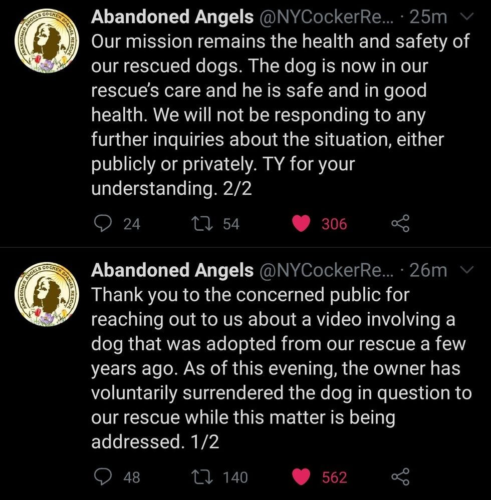 Also, the Cocker rescue where Ms. Cooper acquired the innocent animal she caused to yelp, while she was on the phone lying about a black man, has taken that dog back: