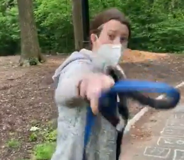 In this one, a white woman in Central Park named Amy Cooper is walking her dog off-leash in the Ramble, which is very popular with the set of humans known as "bird-watchers." A black man named Christian Cooper is there to engage in said activity of "bird-watching," notes that Ms. Cooper has her dog off-leash, and politely asks her to fix that.