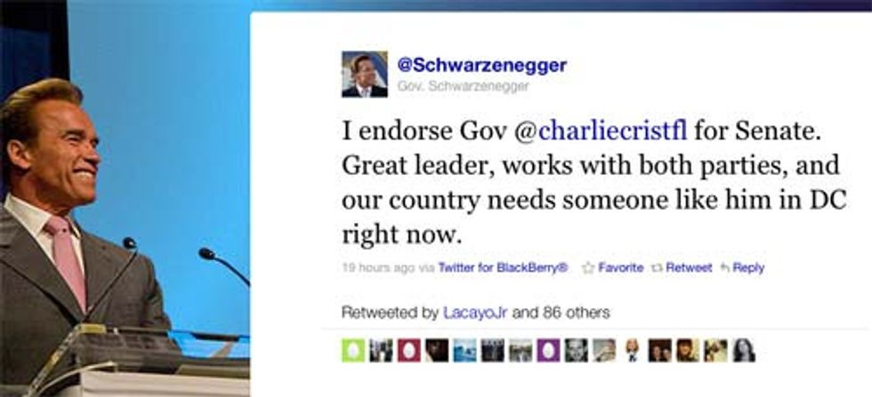 OK now it is after the jump and we can stop being coy: Charlie Crist got endorsed by ARNOLD SCHWARZENEGGER, oh my goodness! Oh, wait, you say it's the year 2010 and he's neither a movie celebrity nor a political celebrity but rather a washed-up lame-duck has-been failure? Tell that to the people who put together the preview for The Expendebles where his cameo was framed like it was the second coming of Christ, buddy. Anyway, here's the Twittering in which Schwarzenegger says that sure, Charlie Crist should be a senator or whatever.