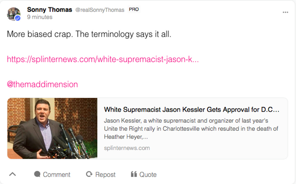 You see, I have scanned every creepy ass alt-right site and Twitter feed I know of, and I could not find a single person who was super excited about going to Kessler's latest event. The closest thing I found was this post on Gab claiming that calling Kessler a White Supremacist showed "bias."