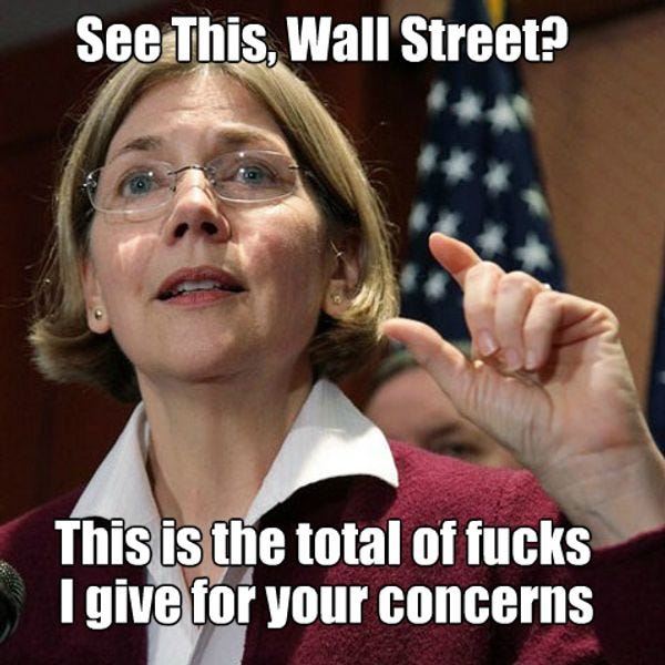 Well, then, guess that makes all of Elizabeth Warren's alleged antipathy to Wall Street just a lot of hooey, doesn't it? She may talk tough about cracking down on banks, but she just loves our card, so gosh, she's one heck of a hypocrite. All she really needs is for a banker to sit down and explain to her how the system works, and then she'll see the light.