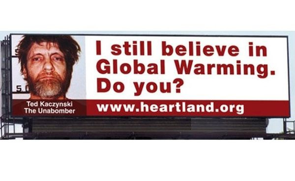 Well look what the end product of tens of millions in donations from rich libertarian energy tycoons and their corporations isΒ at the Heartland Institute: Β A hilarious series of billboards out on the Interstate saying "Derp derp the Unabomber believed in global warming, derp, splat, are you theUnabomber?" They come in a variety of other mass murderer/dictator flavors, too, because the Heartland Institute is a very serious public policy organization.