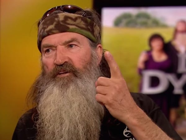 “And now there’s grown men barging in on you ladies while you’re putting your Maybelline on,” he explained dejectedly, before explaining that you can tell he is a man by his beard that he has, and also swearing to the ladies that he would never, EVER walk in on them in the restroom. Which is fine! Because he's a man! As a man, he should not be using the women's restroom. However, a trans woman -- unlike Phil Robertson -- is not a man, so it works out well for everyone! Yay! Except for all the people who will be murdered in wars and on our streets because there are people who aren't having sex or going to the bathroom the way Phil Robertson would prefer, and also not believing in Jesus even though even the calendar says he is the son of God!