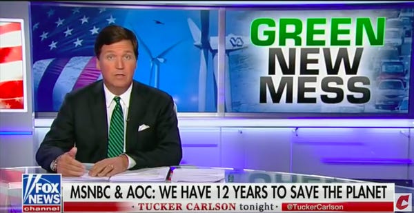 Carlson mocked liberals for believing "all life on this planet" would end in 12 years. No one, by the way, believes this. What Ocasio-Cortez and actual climate scientists have said is that we have 12 years to avoid irreversible damage to the climate. It is somehow "funny" for conservatives to pretend Ocasio-Cortez is running around Congress shouting the "end of the world is nigh."
