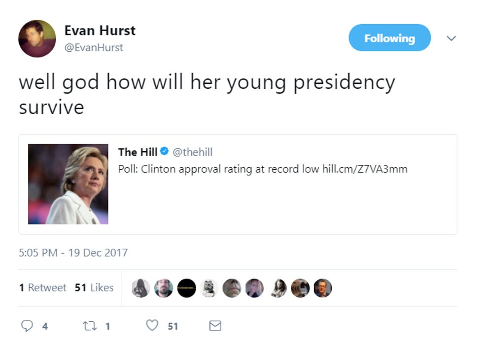 TOO SOON, HILLARY, TOO SOON! Cillizza's argument is that it's too soon after the 2016 election to expect people to like Hillary Clinton -- golly, Chris Cillizza surely still doesn't! Maybe if she goes away for a hundred years, people will forget why they hated her in the first place. (Chris Cillizza will not forget. Chris Cillizza is like A Elephant Who Never Forgets when it comes to why he hates Hillary, and that is why CNN pays him $$$$$.)