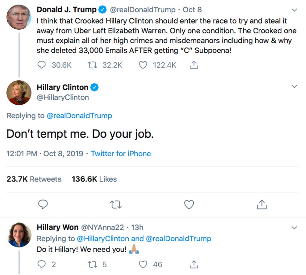 Hillary Clinton epically trolled Donald Trump the other day. Trump suggested in a tweet Tuesday that the people's presidentshould run against him in 2020 instead of the "Uber Left Elizabeth Warren." Clinton responded with the sick burn, "Don't tempt me. Do your job."