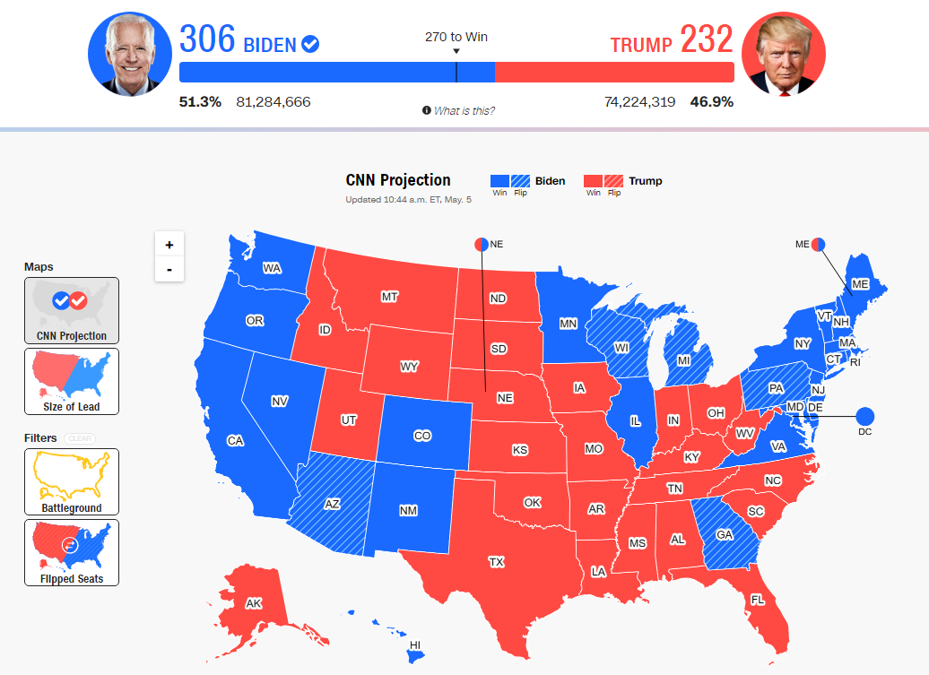 In the 2020 election, 155.5 million people voted. President Joe Biden won the election with 306 electoral votes and 51.3 percent of the national popular vote, compared to Trump's 232 electoral votes and 46.9 percent.