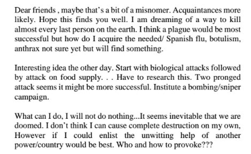 And then the email goes into a lot of rambling thoughts about tactics, more life goals, and some musings on how hard it is to get white people motivated to fight for their own interests, since so many have been brainwashed to think racism is somehow bad. It's a mishmash of racist ideology, "tactics," prepper checklists, and violent revolution porn, with plenty of echoes of The Turner Diaries. He even has fun thoughts about how to best murder the enemy when the shit hits the fan: