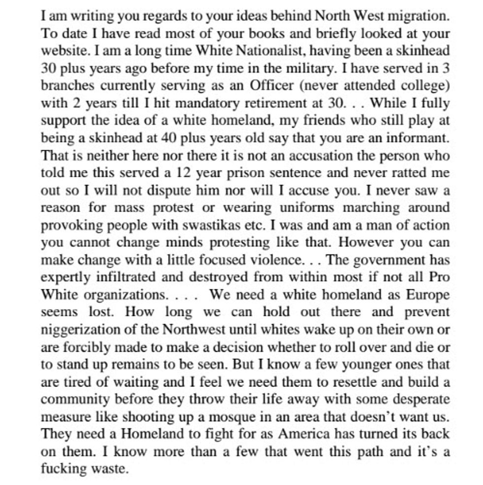 Again, interesting stuff here. Hasson establishes his racist and military bona fides, assures the recipient he knows full well the "movement" is full of government snitches, and says he thinks parading around with swastikas is a waste of time because you'll never change minds that way. Instead, he says he's "a man of action" who knows "you can make change with a little focused violence," and that's what's needed to establish a white homeland in the northwest. Yipes. At least he's concerned about those poor young white nationalists who might throw their lives away through a foolish act like shooting up a mosque. If only they could find shelter in a nice Aryan homeland, poor things.
