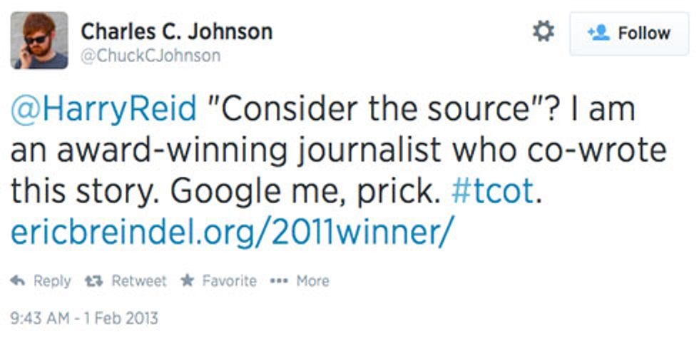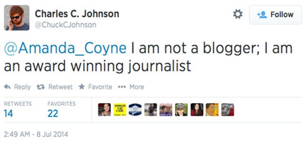 Charles C. "Chuck" Johnson may not be a blogger, but my goodness, the kid sure can type! Don't you want to fund his typing? He's got, like, a kickstarter for a gofundme or something, so you should give all yr moneys to Chuck! You want hard-hitting journalism? Are you sure? Here's Charles C. Johnson clarifying some of his recent journalism: "There is no proof that [my wild new NRSC accusation] is true," he explained to a handful of non-award-winning journalists, "but there is no proof that it is not true." YES. I am standing up in my chair and Cheering 4 Chuck™ right now! Ow, it's a swiveling chair and I fell and hit my head.