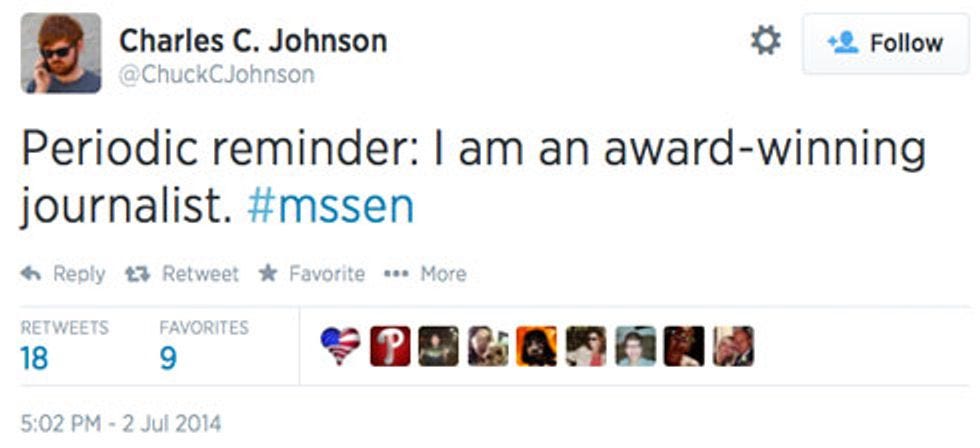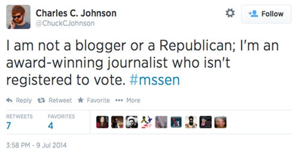 Move over Ben Shapiro, because it's safe to say that Yer Wonkette, collectively, is simply head over heels for Charles C. "Chuck" Johnson , the brave not-a-blogger (HE'S AN AWARD-WINNING JOURNALIST!!!) who has attached himself to the Mississippi Senate runoff controversy like a particularly tenacious hagfish. Johnson does not care for Thad Cochran! Not even the teensiest bit! But I'm not going to get into the whole "who is right and who is wrong" thing, because unlike Charles C. Johnson, I am JUST a blogger, no "Webbys," so what do I know? What I do know is that RIGHT NOW is clearly Johnson's moment in the sun. So many people paying attention to Chuck and mentioning him in Tweets 'n' such! Alas, enjoy it while you can, because you know about redheads and the sun, right? Join me after the jump, and we'll get deeper into Charles C. Johnson. HAWT.