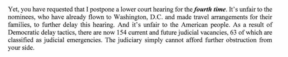 Grassley rejected the Dems' request, because he has HAD IT with all the Democratic game-playing, by golly! For one thing, he said, the two nominees' hearings were already delayed twice by the minor distraction of Brett Kavanaugh being accused of attempted rape, and THAT was pretty selfish of you, My Esteemed Colleague (Grassley only mentions the dates, not the actual reason the hearings were delayed).