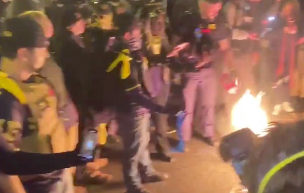And, at one point, some Proud Boys got it into their heads to tear down a Black Lives Matter banner from Asbury United Methodist Church in Washington DC, a historically Black church, and then set it on fire while cheering and chanting "Fuck Antifa." They also chanted "Whose streets? Our streets," because they can't come up with their own material.