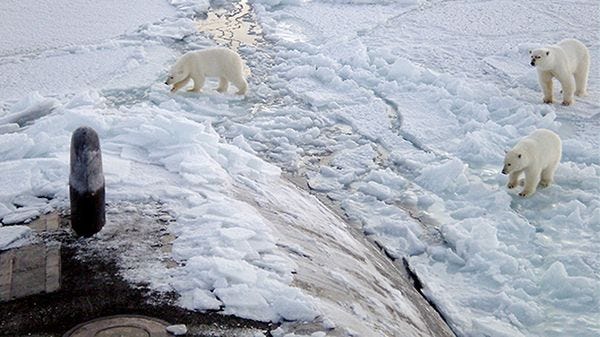 Polar bears check out the USS Honolulu near the North Pole