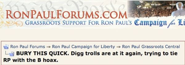 Um, "Digg is totally hijacked by COINTELPRO and Likud party hacks. The best way to stop them is to allow the artificial world from whence they came to collapse,, and don't bother to feed them when they come begging." &c. [ Ron Paul Forums ]