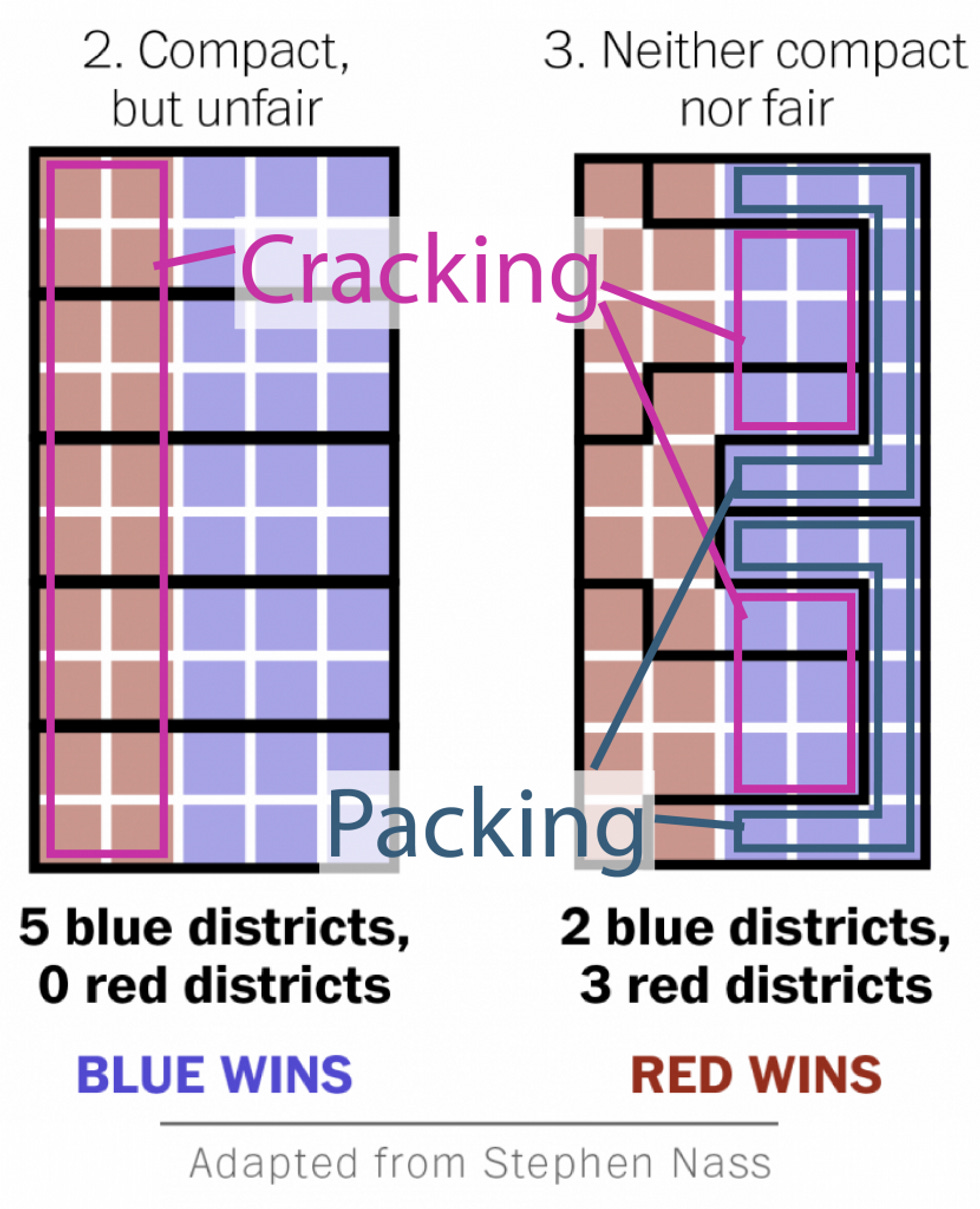 Spoiler Alert: NO. The Voting Rights Act does not mandate quotas for Congressional Districts. It says that states can't manipulate districts to lessen the impact of minority votes by "cracking,"spreading minority voters among several districts to dilute the impact of their votes, or"packing," jamming all the minority voters into one district so they only ever get one representative.