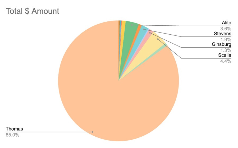 Or, if you prefer to use pie charts so you can see just how large a percentage of dessert Clarence Thomas is hogging, Quinta Jurecic of Above the Law made this: