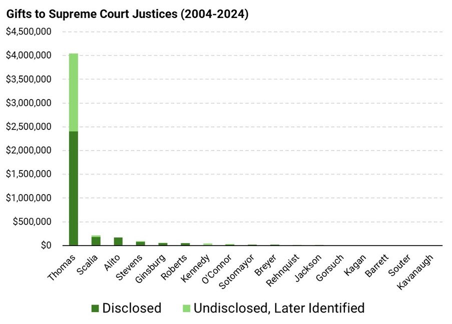 Luckily the folks at Fix the Court have put together numbers and estimated value of all the gifts given to all Supreme Court justices over the last 20 years, both reported and unreported to the Federal Trade Commission. Unsurprisingly, Clarence Thomas tops the list by, to put it delicately, a metric fuck-ton: