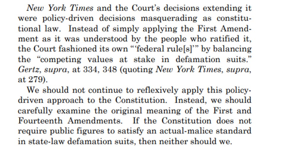Thomas is not impressed, because, you see, in deciding Times v. Sullivan, the Court completely failed to adhere to the fiction of "originalism," which requires all courts to pretend they can read the minds of the Founders to accomplish whatever modern rightwing goals they want..