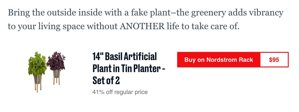 A NINETY FIVE DOLLAR FAKE BASIL. SIGN ME UP I WILL TAKE FIFTY, NORDSTROM RACK JUST GETS ME, YOU KNOW!