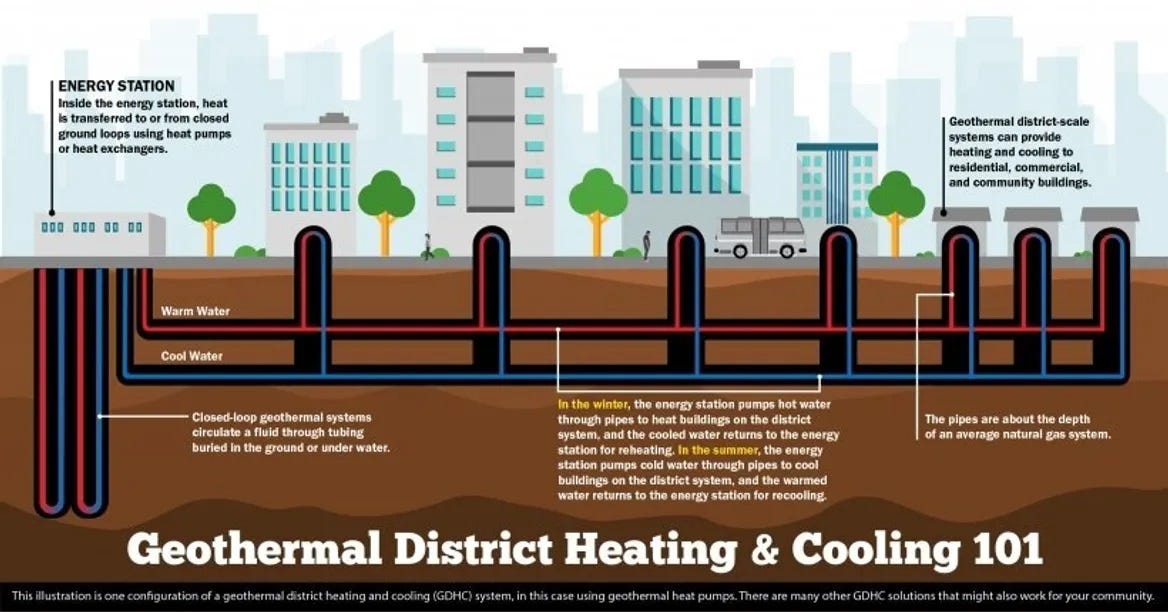 It’s an idea called “district heating” that you’ll be hearing about a lot in coming years, although the basic concept has been around forever. If you went to a large university or have worked on a big corporate campus, you’ve probably already been in buildings that were warmed and/or cooled by a central system that moves hot or cold water around to serve multiple locations, although most existing systems use a boiler that runs on coal or methane gas. But there’s no reason heating/cooling systems can’t use other energy sources, like hot water from underground (Boise has done that since the 1890s), but that’s not all.