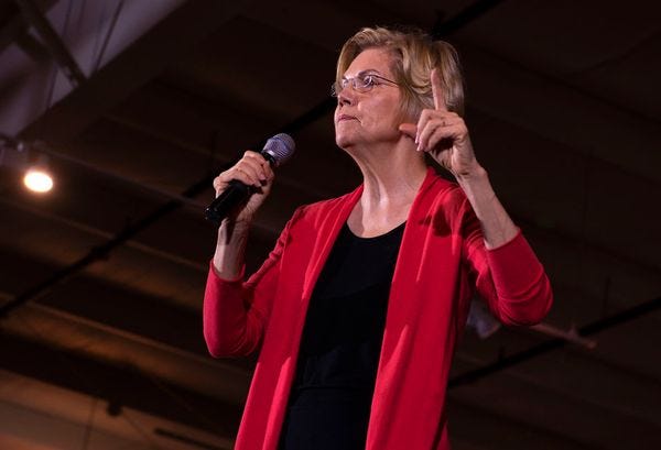 Cramer wants you to know, this Warren, she's scary: "When you get off the desk and you talk to executives, they're more fearful of her winning." the refrain from his executive times with executives is "She's gotta be stopped! She'sgotta be stopped!" He nonetheless predicted that Warren would win Iowa, because she's a "very compelling figure on the stump," and if we were in the Warren campaign, we'd be worried that this loser picked our candidate. But then Faber kept piling on with more reasons to like Warren: